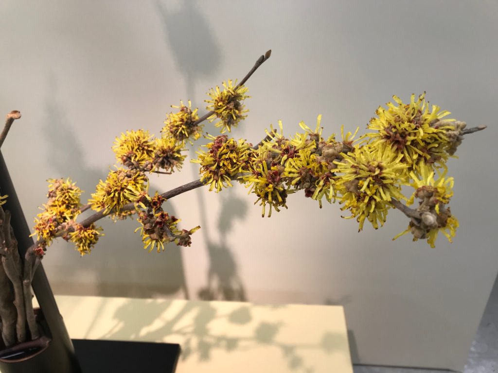 冬の季節に、黄色の花を咲かせ、早く春を告げる花です。学名はHamamelis、ギリシャ語の「Hamame(共に)」と「melon(リンゴの果実)」をくみあわせたものです。花と実を同時に付けることに由来しています。