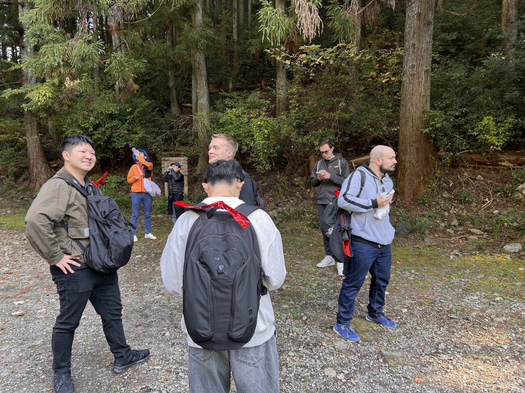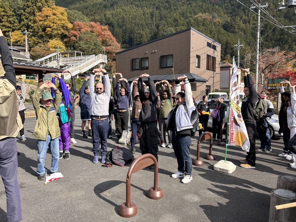 まず、出席確認をし、ハイキングに出発する前に、みんなでストレッチをしました。そして8つのループに分かれて、10:45、鳩ノ巣駅を出発しました。
