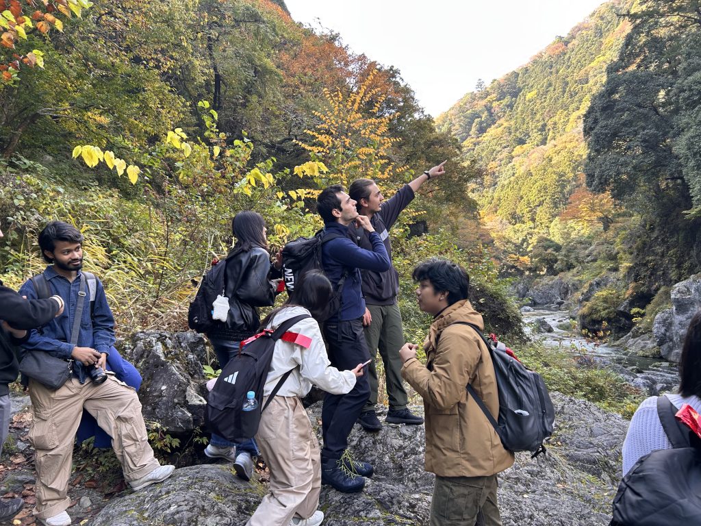 奥多摩は東京都です。東京駅から約2時間くらいで奥多摩につきます。東京は思ったより緑が多く、ちょっと足を延ばせば自然豊かな風景に触れることができます。学生たちは秋の紅葉と奥深い自然の息吹を充分に感じることができたと思います。 -