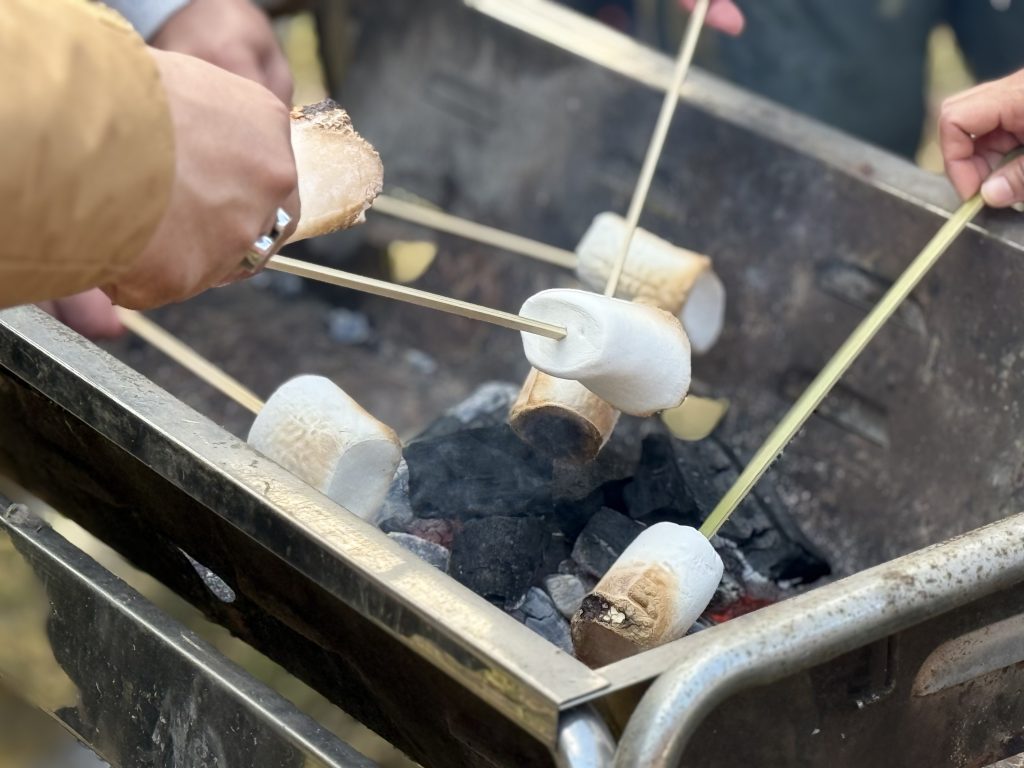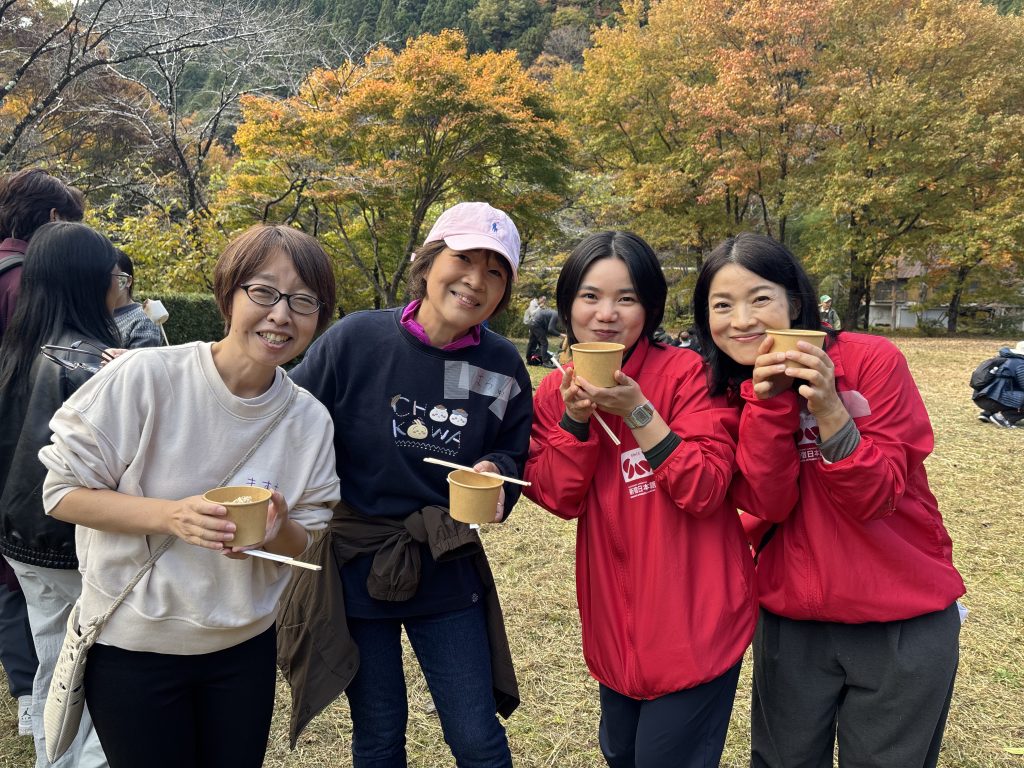切通から20分ほど歩き、14:00、研修所に到着。早速お昼ご飯を食べました。各自持ってきたお弁当やおにぎりのほか、理事長の手作りの豚汁が振舞われ、皆嬉しそうに食べていました。デザートにマシュマロを火にあぶって食べました。